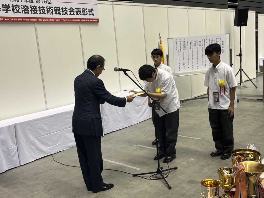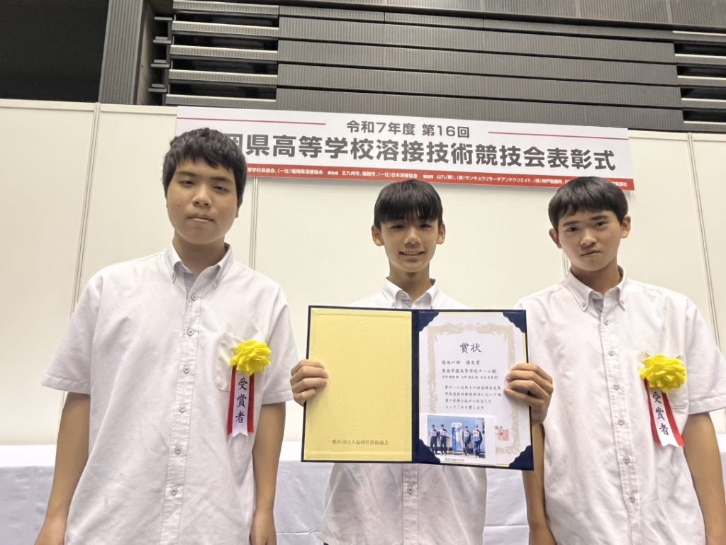 本校は福岡県5位 優良賞で表彰していただきました。福岡県私学唯一の入賞です。表彰生徒機械システム科3年 長野楓雅機械システム科2年 北野誠也機械システム科2年 末永育夢